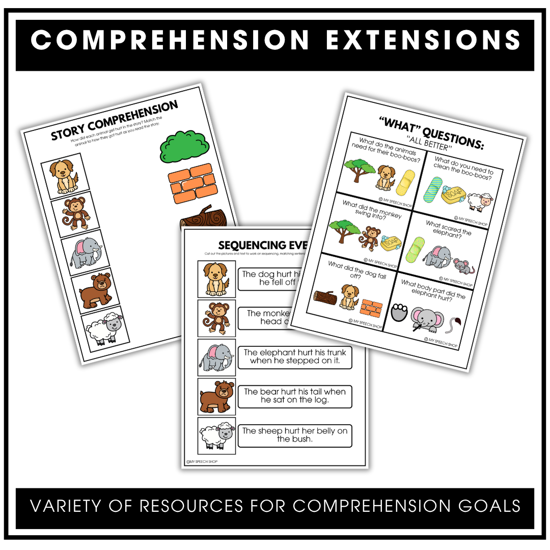 - Story comprehension activities: sequencing, wh-questions, matching who/what