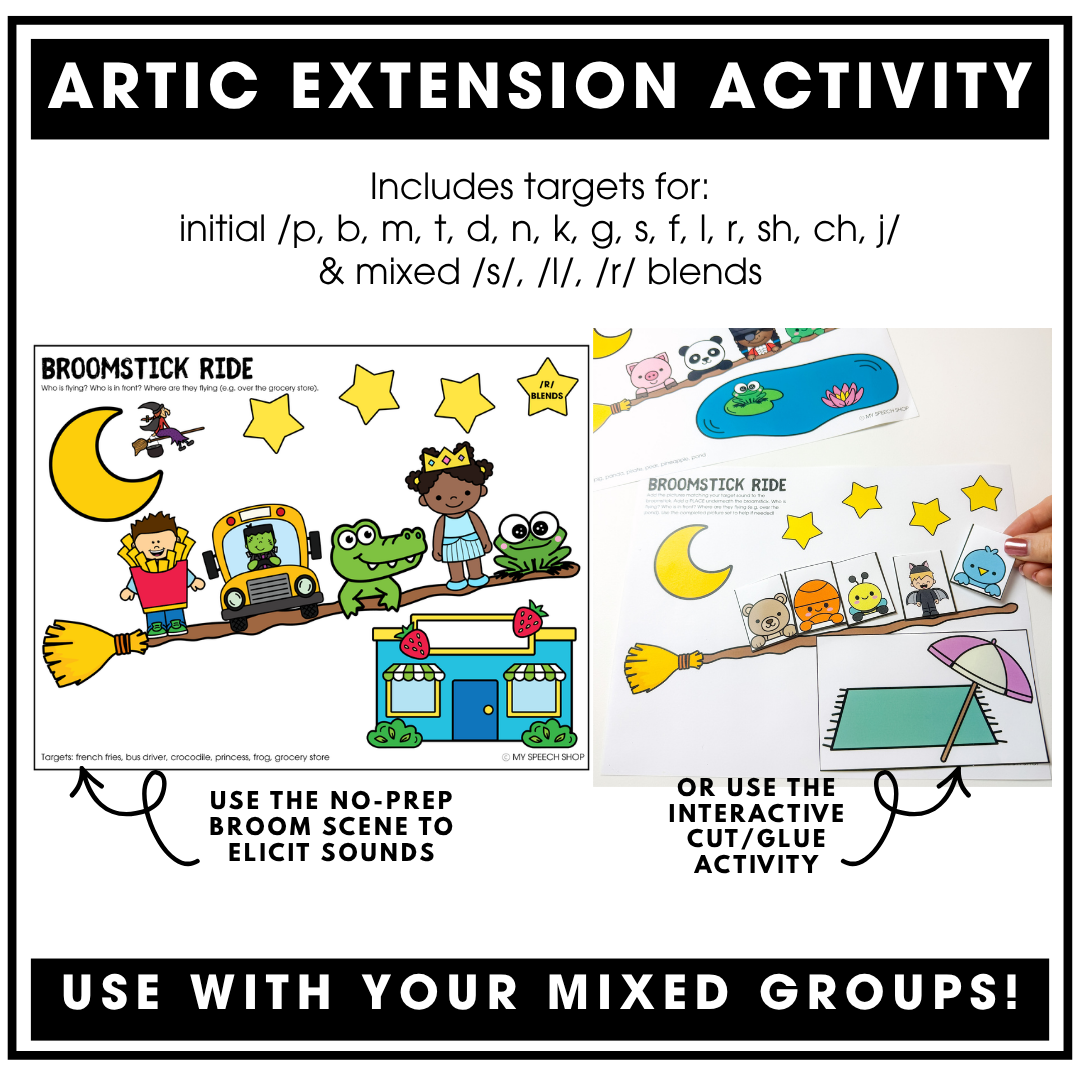 - 🧹 Broomstick Ride - includes NO PREP artic scenes for below targets as well as INTERACTIVE cut/glue option for all targeted speech sounds: