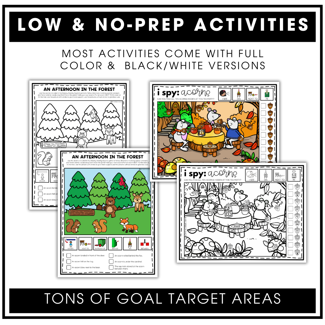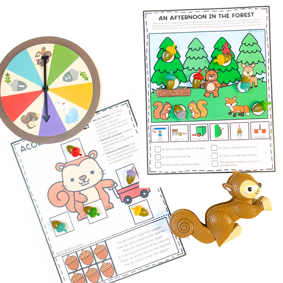 The Sneaky Snacky Squirrel game is great for fall-themed speech therapy ~ comes with a FREE speech therapy companion! Your forest friends are hungry and they need your help! Spin the spinner, squeeze the matching colored acorn with your Squirrel Squeezer, and place it into your log. Be the first to fill your log with delicious acorns and you win!
